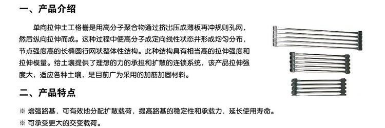 單向拉伸的土工格柵是由高分子聚合物經擠出壓成薄板再沖規(guī)則孔網,然后縱向拉伸而成。這種過程中使高分子成定向線性狀態(tài)并形成分布均勻、節(jié)點強度高的長 橢圓形網狀整體性結構。此種結構具有相當高的拉伸強度和拉伸模量,特別是我公司此類產品更具有超國際水平的高早期(伸長率在2%—5%)拉伸強度和拉伸模 量。給土壤提供了理想的力的承擔和擴散的連鎖系統(tǒng)。該產品拉伸強度大(>150Mpa),適應各種土壤,是目前廣為采用的加筋加固材料。